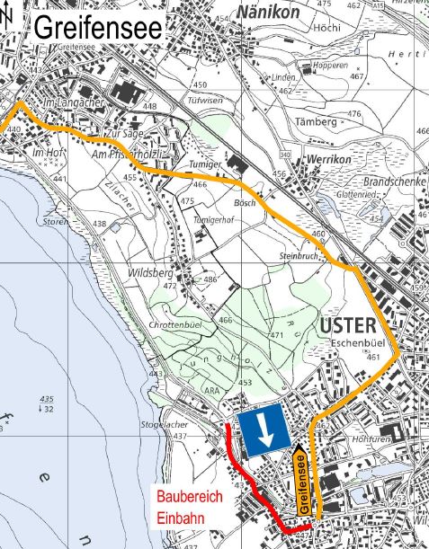 Der Verkehr wird weiterhin im Einbahnregime durch den Baustellenbereich geführt (Fahrtrichtung Greifensee nach Niederuster). Die grossräumige Umleitung in Fahrtrichtung Niederuster nach Greifensee wird wie bisher beibehalten; die entsprechende Verkehrsführung ist im Plan ersichtlich.
